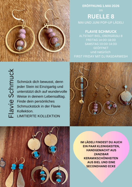 « 10 ans de First Friday. 10 bouteilles de gin. Nous fêtons l'anniversaire de First Friday ! Avec un gin d'exception dans des bouteilles tout aussi belles. Viens nous rendre visite au 6, Schmiedengasse, fais-toi servir un verre et découvre des bijoux fabriqués à la main dans la vieille ville de Bienne. Le gin est servi au bar, les bijoux sont en vente dans la boutique. Les deux valent le détour. » Merci Fäbu, on passe te voir ! 😉