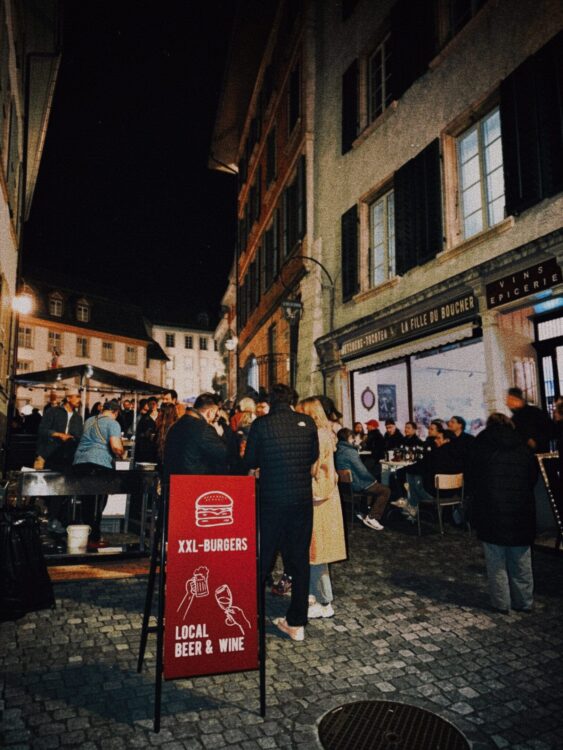 La boucherie fait aussi office de bistrot, mais lors du First Friday, l’ambiance y est encore plus animée. « Nous ouvrons nos portes et accueillons la vieille ville jusqu’à tard dans la nuit. Au menu : nos burgers XXL préparés à Bienne. Le tout accompagné de bières locales et de vins sélectionnés. Passe nous voir, installe-toi, prends un verre et profite de la soirée avec nous. »