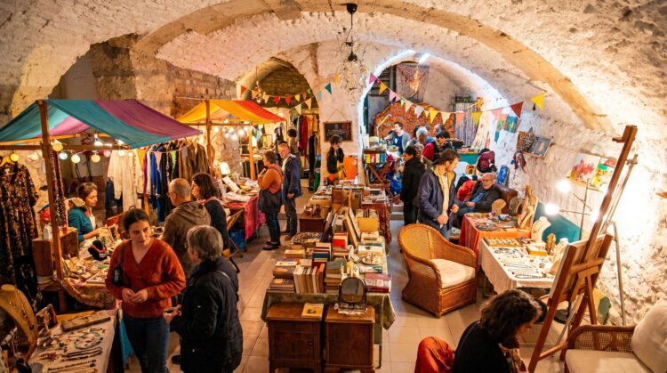 Devant la cave à la rue haute, Babalubijoux présente sa nouvelle collection estivale aux motifs rafraîchissants, ainsi qu'un marché aux puces convivial dans la cave voûtée, où l'on trouve des objets uniques.