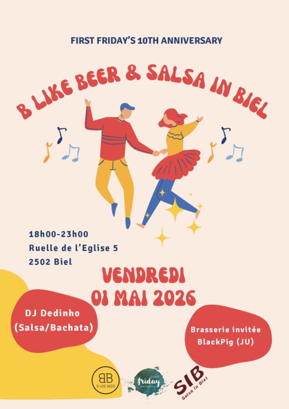 « Nous célébrons le 10e anniversaire du First Friday en collaboration avec l'école de salsa « Salsa in Biel », qui viendra nous rejoindre avec ses élèves et son DJ résident Dedinho. Ils feront danser la vieille ville au rythme de la salsa, de la samba, de la kizomba et de la bachata, et créeront une ambiance 100 % cubaine. Ce sera Bienne à La Havane, vamos a bailar !